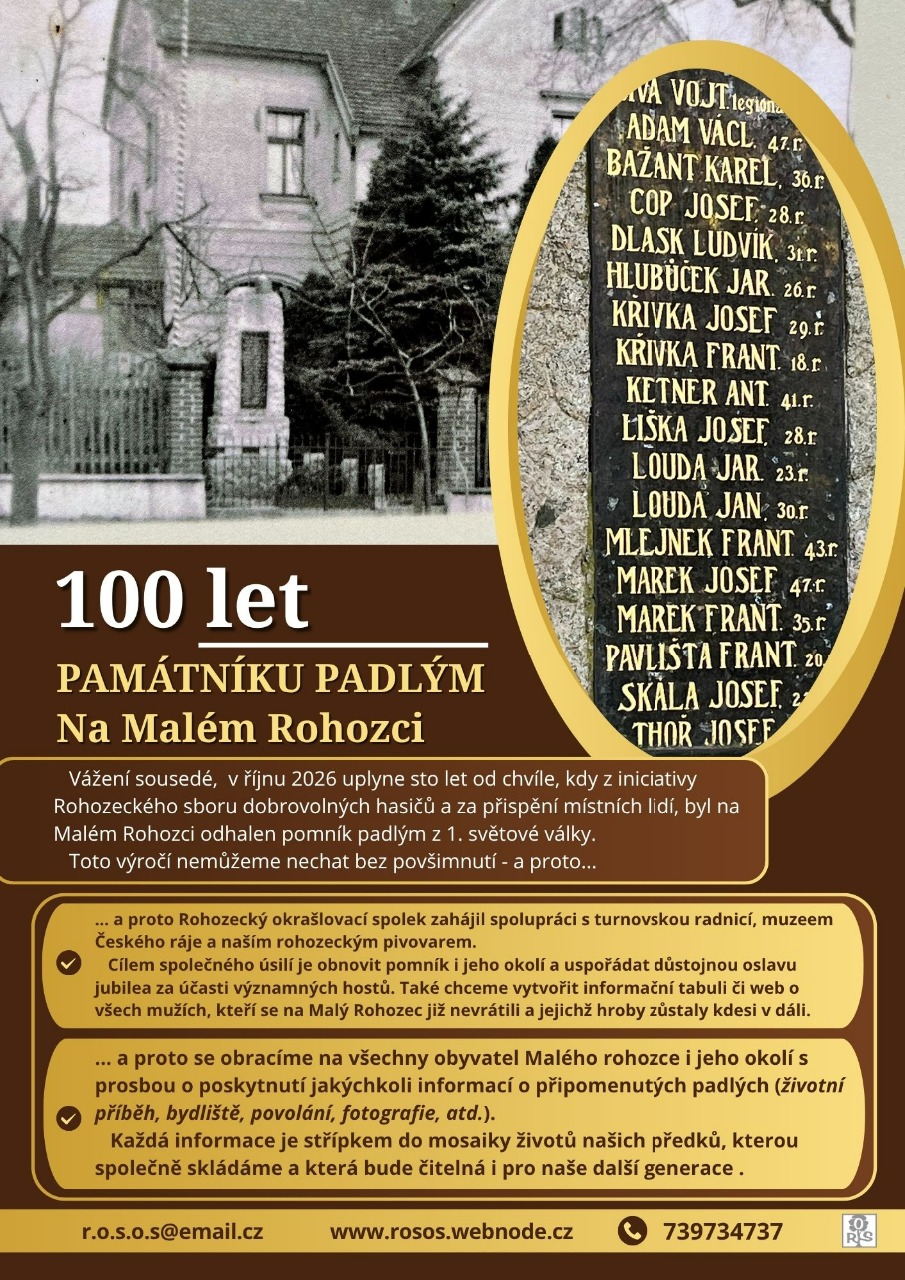 ROS v současné době intenzivně pracuje na novém projektu, jehož cílem je obnovit pomník padlým z 1. světové vánky u bývalé školy na Malém Rohozci do původní podoby, revitalizace jeho okolí a zmapování osudů našich padlých předků.